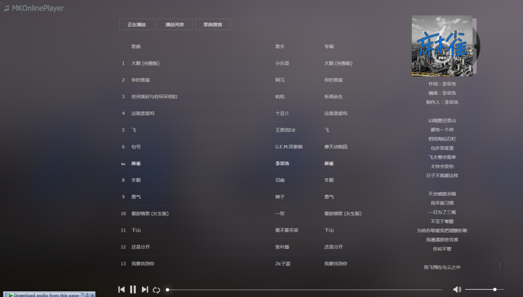 MKOnlineMusicPlayer在线音乐播放器 原作者地址:https://github.com/mengkunsoft/MKOnlineMusicPlayer 演示网站:https://mp3.cqiot.cc 到源作者网站下载文件上传到你的网站空间,打开网页就可以播放了