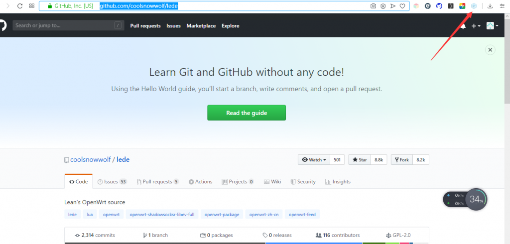 安装好插件后 打开lede项目地址https://github.com/coolsnowwolf/lede 点击右上角的插件,就会转到gitpod,通过github账号登录。