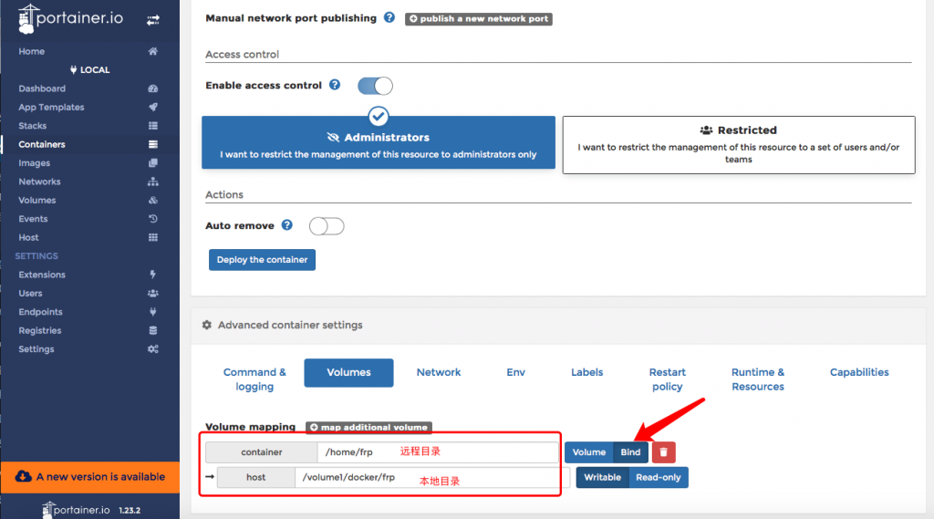 远程目录需要先部署好后进命令行新建好容器内目录后再映射